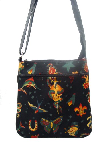 US HANDMADE FASHION SKULLS ROSE TATTOO ROCKABILLY Pattern Cross Over Body Shoulder Bag Style Ha...