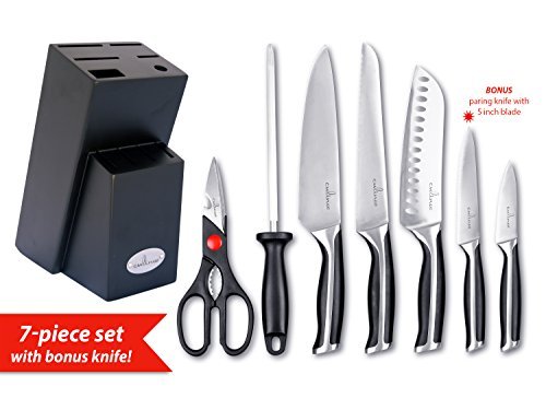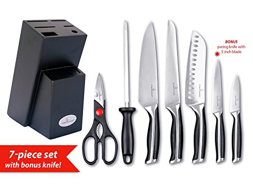 Knife block dim: 8.5-inch L x 3.5-inch W. Rubber wood. Unique Black color. 7 slots: safe storage + protection against fast dulling for long lasting service