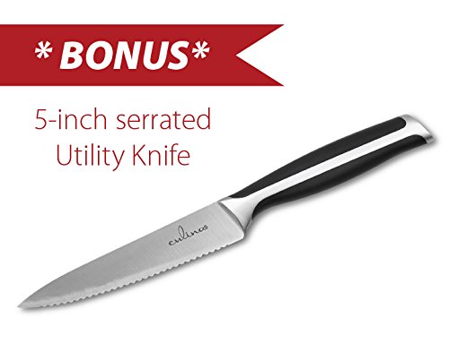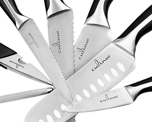 German Steel, full tang blades: thick, high carbon stainless steel. Knife cut from a single sheet of metal. Contoured, seamless ABS handle, hefty grip