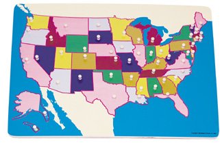 Studio : Callie's Corner Publisher : Callie's Corner Binding : Toy Product Description Exclusive design crafted from excellent quality 3/8" thick hardwood for years of use at an affordable price! Purposely made a little smaller than other Montessori manufacturers, one child can easily carry each map, yet the knobbed puzzle pieces are large enough to make it a concrete learning experience. Vibrant, non-toxic, scratch resistant colors and a smooth lacquer finish, these puzzles have been engineered for durability as well as aesthetics. These puzzles are produced using a printing process, which allows capture of more border and coastline detail than is achieved in hand-painted versions. Moreover, a printing process allows volume production and more efficient manufacture, and you reap the cost savings. Puzzles measure 19-5/8 x 14-5/8 x 3/8" thick. For the United States, the knobs are placed on the state capitals. Control Maps Outlines available and sold separately. See C5957 0