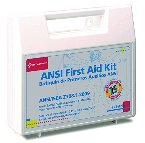 This 110pc., 25-person bulk kit meets all OSHA and ANSI standards, and is designed for use in small offices, vehicles and work sites. The partitioned, water-resistant plastic case is wall-mountable, yet has a handle for easy carrying.