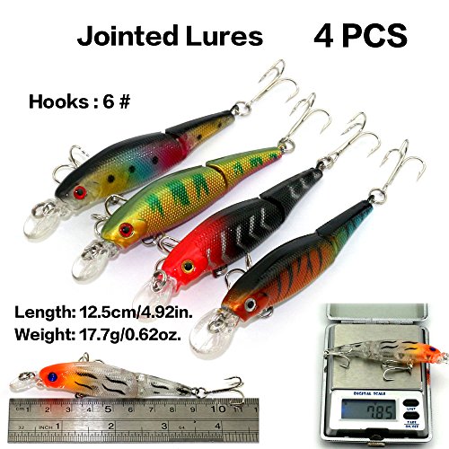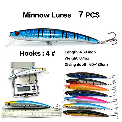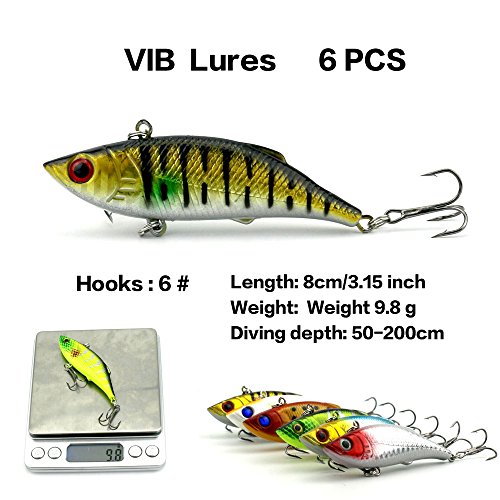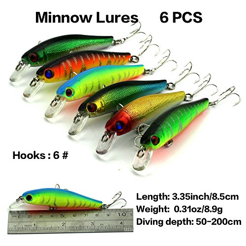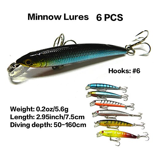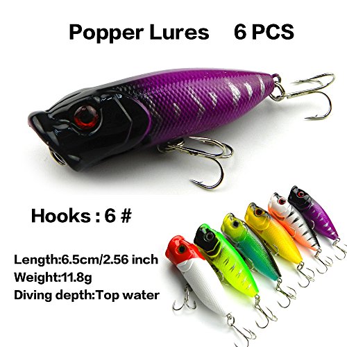 -. Feature : 7 different baits:Popper 6pcs,Minnow 6+6+7+6pcs(4 different styles),VIB 6+6pcs(2 different styles). / Hard lures life-like swimming action in the water, more attractive,3D stereoscopic eyes, more realistic and vivid. / All Set are made with premium high quality plastic. This makes the lure soft, flexible with highresolution body detail, life-like swimming actions in water, and a hidden hook / Great for Bass, Perch, Panfish,Perch,Trout,even pike and salmon!This kit is best gift for your friends and families / Colors will be sent by random, but not to impact the quality and quantity