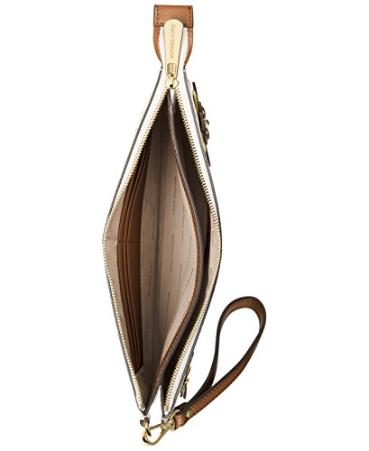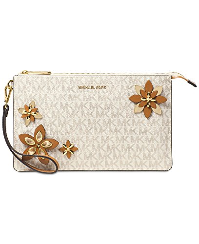 -. Feature : MK Signature Coated Twill faux leather; lining: polyester / Exterior features gold-tone hardware / 6-1/4"L detachable wrist strap. Zip closure. / Interior features 1 slip pocket and 6 credit card slots; double compartment design with 2 open compartments / 10"W x 6"H x 3/4"D
