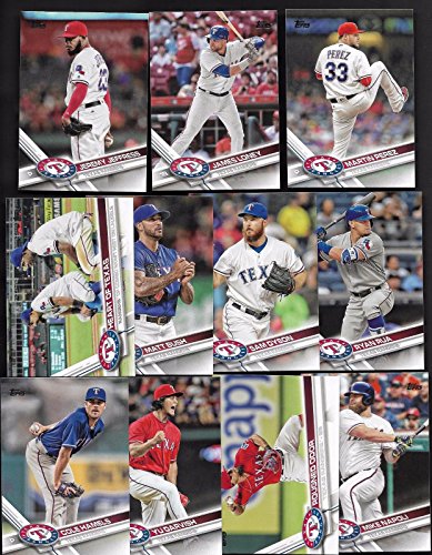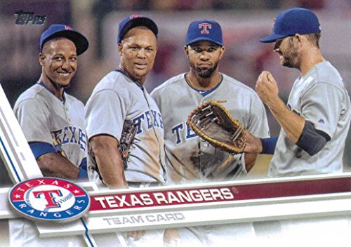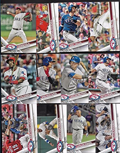 It includes all Rangers Cards from series #1 and #2 including Elvis Andrus, Rougned Odor, Adrian Beltre, Joey Gallo, Keone Kela, Shin-Soo Choo, Jeremy Jeffress, Carlos Gomez, Sam Dyson, Ryan Rua, Martin Perez, Cole Hamels, Yu Darvish, Mike Napoli, James Loney, Matt Bush, Carlos Beltran, Mitch Moreland, Nomar Mazara, Jonathan Lucroy, Jurickson Profar, a "Heart of Texas" card and a Rangers Team Card.