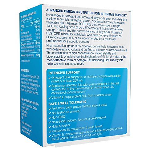Pharmepa RESTORE triple strength 90% concentration omega-3 fish oil delivers 1000 mg daily doses of EPA omega-3 for intensive support. Taking EPA in doses in excess of 1000 mg daily helps to restore the appropriate balance between omega-3 and omega-6 fatty acids, while the rTG form of omega-3 delivers higher levels of EPA and DHA into cells, faster. Pharmepa RESTORE provides 500 mg of active EPA in each softgel, from 90% concentration fish oil, so the softgels are small and easy to swallow (typically half the size of most fish oils). Large omega-3 capsules can overload the body, reduce absorption and increase the risk of the body producing unwanted lipid peroxidation products, so we deliberately use small capsules to support split dosing twice daily; this optimizes absorption so that users reap the full benefits of EPA – and in the safest way possible. This pharmaceutical-grade fish oil is in a very absorbable triglyceride form and offers exceptional purity. Nature-identical triglyceride (rTG) omega-3 is the most effective form of omega-3 at delivering EPA and DHA directly into cells where they are needed most, because it is the only type of omega-3 to offer high concentration and strong bioavailability as well as optimal doses of active ingredients. rTG omega-3 increases cellular omega-3 levels 5x more than krill oil and 3.5x more than standard fish oil. Molecular distillation ensures the oil is free from PCBs, dioxins and mercury. Each batch is 3rd party tested to guarantee the quality and this supplement is produced in GMP accredited facilities.