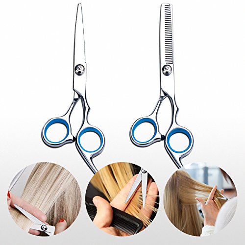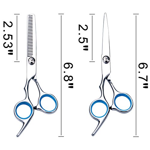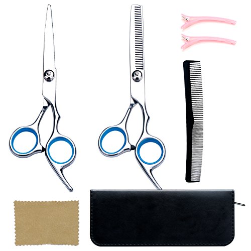 - Package includes: 1 x regular hair scissors; 1 x thinning scissors; 1 x cleaning cloth, 1 x grooming comb, 2 x hair clips, comes with a black case for safety storage.
