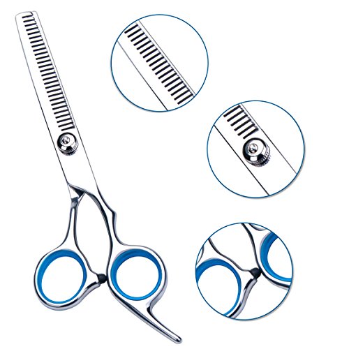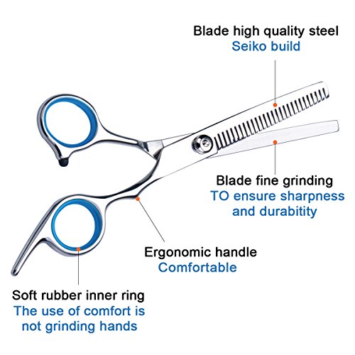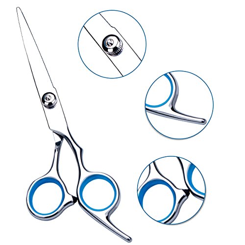 - Hair cutting shears can be easily tighten or loosen with the included tension and adjustment screw. Comfortable finger rests, remove the blue finger ring, the ring size will be larger. Custom design to best fit every individual.