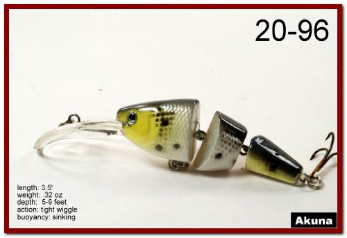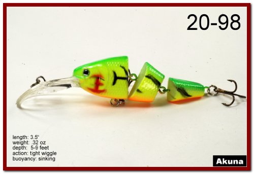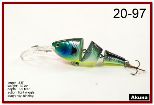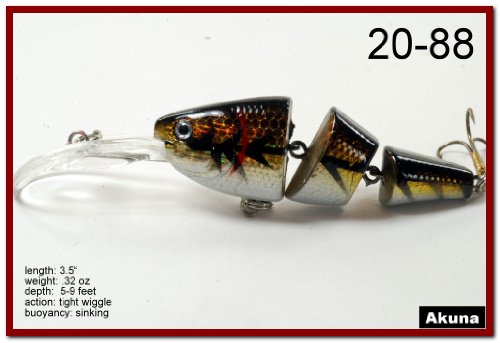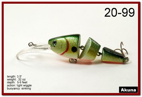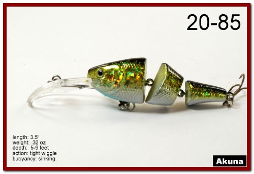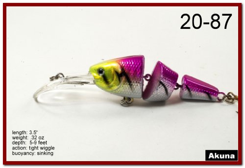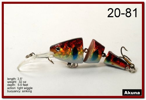 -. Binding : Sports -. Brand : Akuna -. Feature : Multi-Jointed / 1.25 Inch Narrow Bill / Great Color Selection / Exceptional colors and body effects / Great Gift Idea -. Model : BP 5 FLA 20 C-P -. PackageQuantity : 1 -. ProductGroup : Sports -. ProductTypeName : SPORTING_GOODS -. Title : Akuna Pack of 5 Wobblin Goblin Series 3.5 inch Jointed Fishing Lure