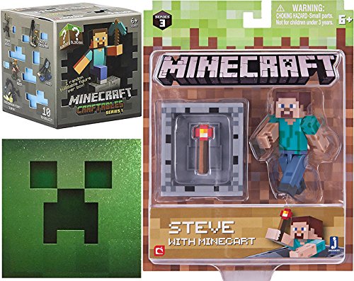 -. Feature : Minecraft Gamer Gear / A game about placing blocks and going on adventures. / Minecraft Figure Includes Steve, Minecart and Redstone Torch / Player Steve with Minecart an extremely fast vehicle that is placed on the rail and can hold items. / Minecraft Minecraft Craftables Series 1 - 3" L Mystery Pack buildable figures Blind Box / CREEPER Foil Sticker - 2x2" Classic creeper face block sticker