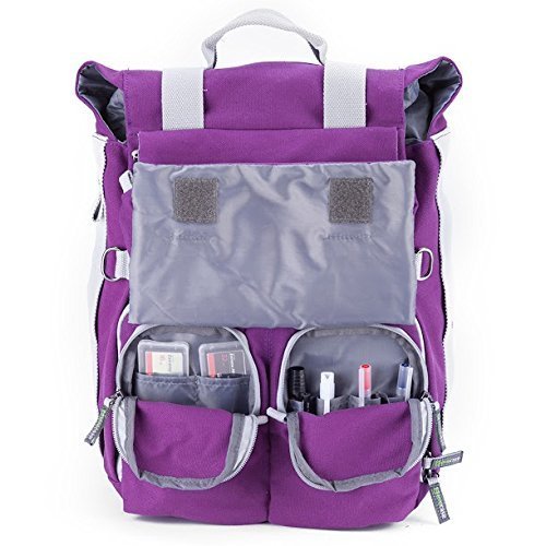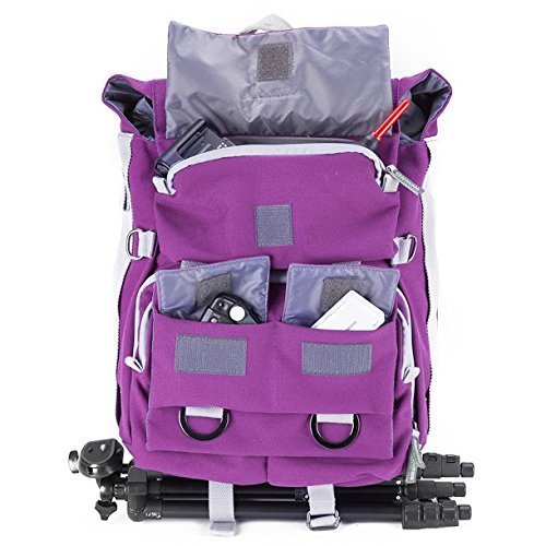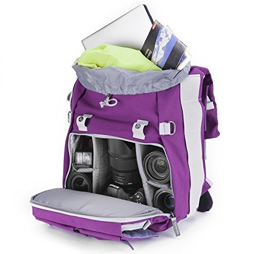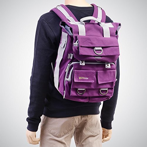 The Evecase DSLR and Laptop Backpack was designed to hold your photo and tools while you are traveling. It features a customizable interior which can hold camera body, 2-5 lenses, laptop compartment that holds 14inch laptop, chromebook, Tablet, plenty of pockets, pouches and spaces jackets, books, tripod, and other accessories. Rain or Shine, Wet or dry, the removable rain cover will give your backpack the best protection. Fashionable canvas design with discreet look that won't stand out as camera backpack.