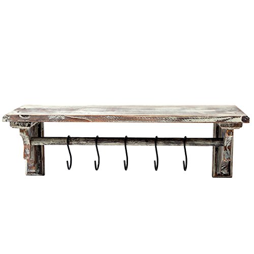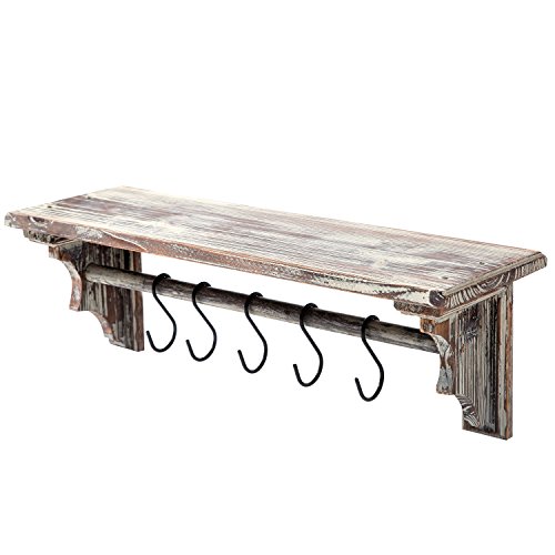 Wall Mounted Torched Wood Kitchen Storage Shelf and Towel Bar with 5 Hanging Removable S-Hooks