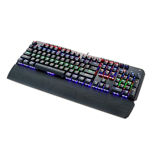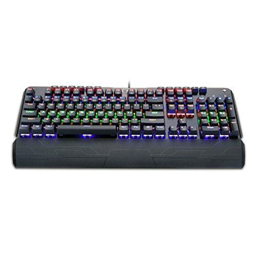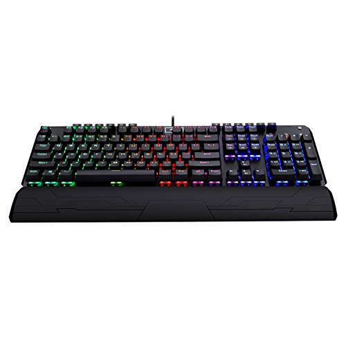 -. Feature : Custom mechanical switches (Cherry Green equivalent) for ultimate gaming performance / LED backlight adjustable lighting and double-shot injection molded keycaps for crystal clear backlighting / Aluminum and ABS construction, plate-mounted mechanical keys, and gold plated USB connector stand up to hardcore gaming / Custom mechanical switches designed for longevity, responsiveness, and durability. Mechanical keys with medium resistance, audible click sound, and tactile feedback / 104 standard conflict free keys, full numeric keypad, 6 multimedia keys, 5 programmable macro keys, and splash-proof design