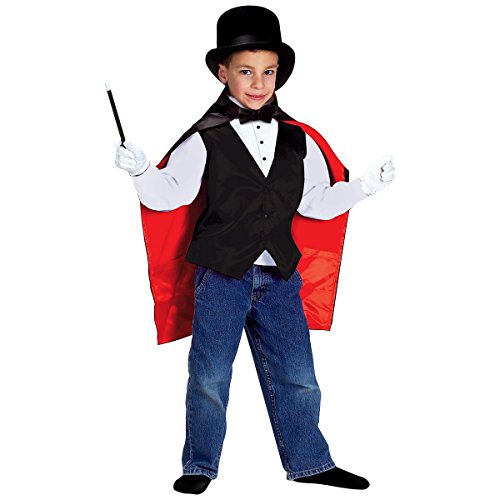 Includes button front vest, cape with pockets, gloves, bow tie, magic wand & top hat.