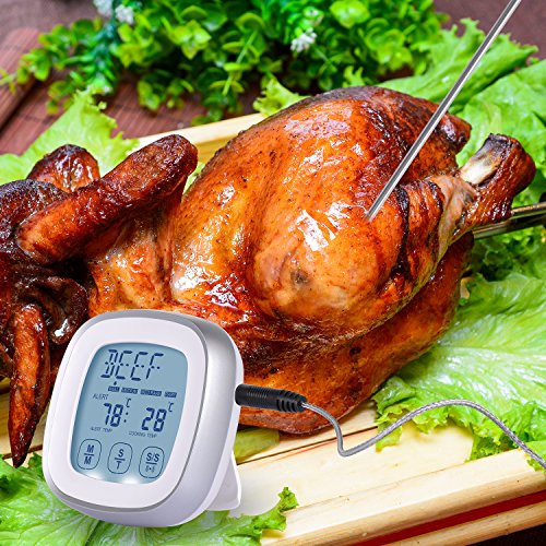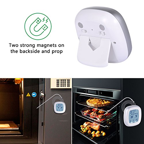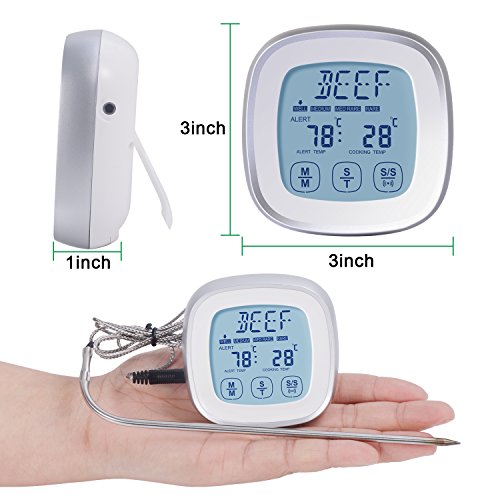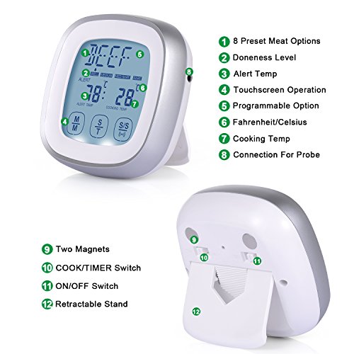 Studio : Adoric Publisher : Adoric Product Description ONE-YEAR Warranty: 12-month free replacement or full refund. Any problems, please feel free to email us.HD Touchscreen LCD Display: Instant and accurate reading, easy to use.Backlight Function: Easy to read temperatures in a dark environment.Programmed Temperatures:8 Types of Meat 5 Levels of Doneness.Countdown Timer and Alarm: Beep alert when reached the target value.? ? Unit Switchable: Free to switch between Fahrenheit Celsius.Wide Temperature Range: Probes and wires can withstand up to 482°F.Waterproof Stainless Steel Probe: Easy to clean with wet cloth.Smart Magnets Stand: Attach it to fridge or place it on counter surface.Wide Application: Great for cooking, BBQ, grill, oven, smoker, kitchen, meat.Batteries Powered: Powered by 2 * AAA batteries (included), easy to replace.Compact Lightweight: Modern and portable design, easy to setup and store. Warm Tips 1. Please DO NOT put the probe on open fire or a closed oven, the max measuring range is 482°F, do not exceed the range, otherwise the probe may be broken. 2. The thermometer is not waterproof, DO NOT immerse it into water. 3. DO NOT touch the probe with bare hands after measuring, to avoid scalding. 4. The probe is sharp, please put it beyond the reach of children.