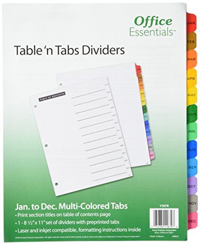 Avery Office essentials dividers are economical and can be used for a variety of binder organization needs. Office essentials table of content dividers January - December multi-color an economical way to organize your binder.