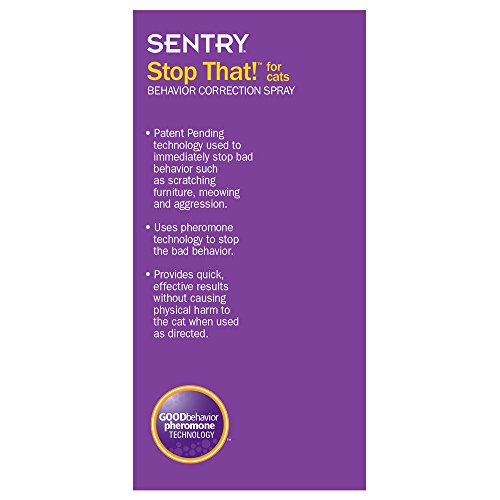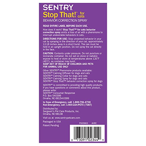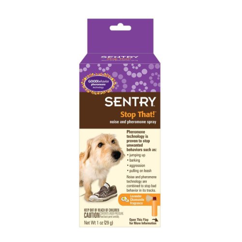 To modify destructive or aggressive behavior, this new product for dogs combines a quick, attention-getting noise and a scientifically proven pheromone mist. The pheromone in the SENTRY Stop That! Spray mimics a natural pheromone and almost immediately calms and refocuses pets to end their negative behavior by reducing their excitability. Unlike other noise-making products that are very temporary, the spray’s pheromone mist redirects the pet’s attention and behavior. The effect is longer lasting than noise alone and helps the pet not to re-engage in the negative behavior. Uses noise and pheromone technology to stop bad behavior. Clinically shown to provide quick, effective results without causing harm to pets. Lavender chamomile fragrance. Patent pending technology.
