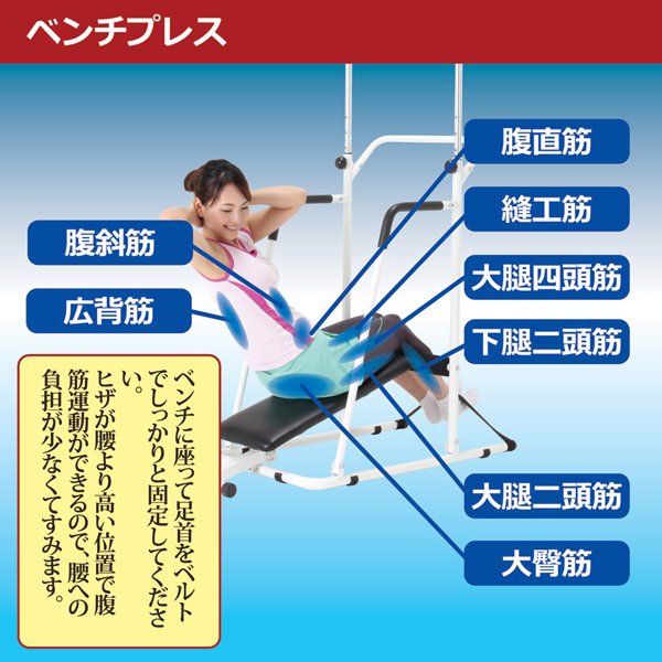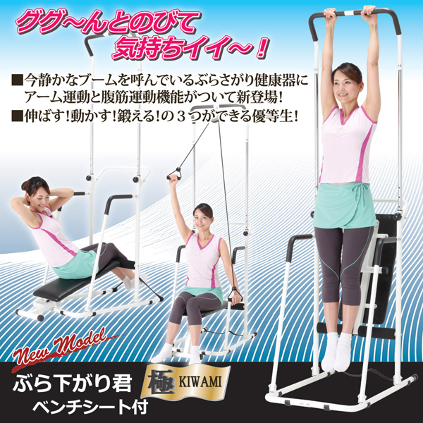 ●本製品は、ぶら下がり運動以外にも、アームエキスパンダーを使った腕の運動や、ベンチシートを使った腹筋運動(ベンチプレス)ができる複合運動器具になってます。