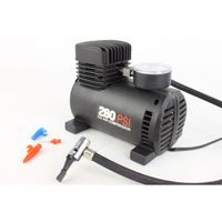 -. Feature : Maximum output of 280PSI / 22" Nylon Air Hose with Quick Release Chuck / 10 Foot Cord plugs into 12-volt Cigarette Lighter / 3 Nozzle Adapters for inflating ties, sports and camping equipment / Lightweight and compact for easy transport and storage