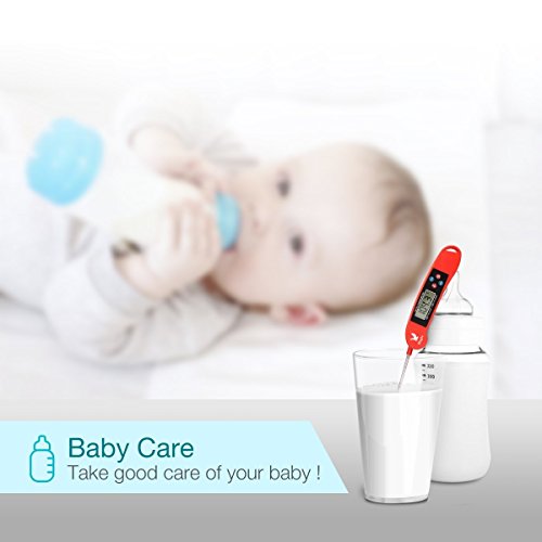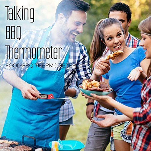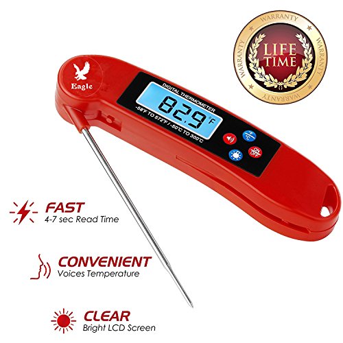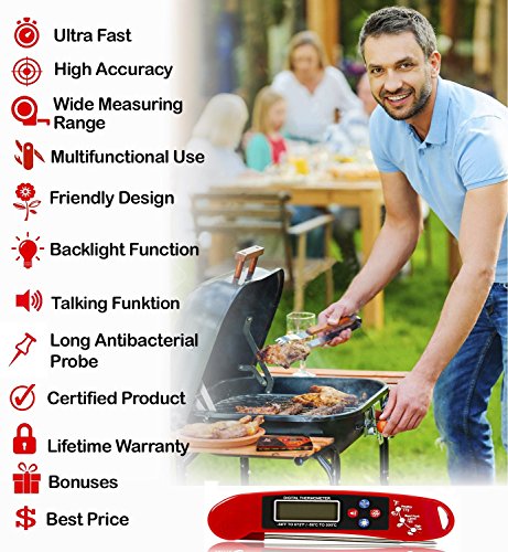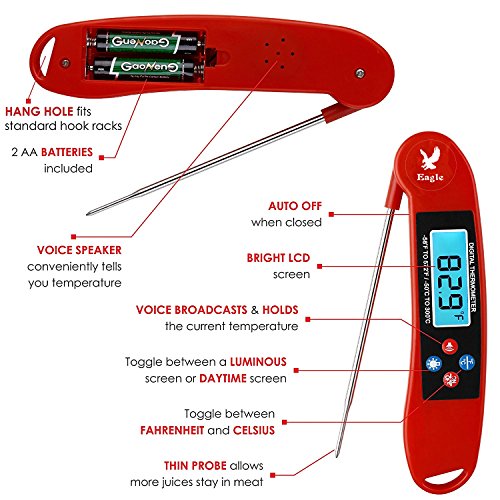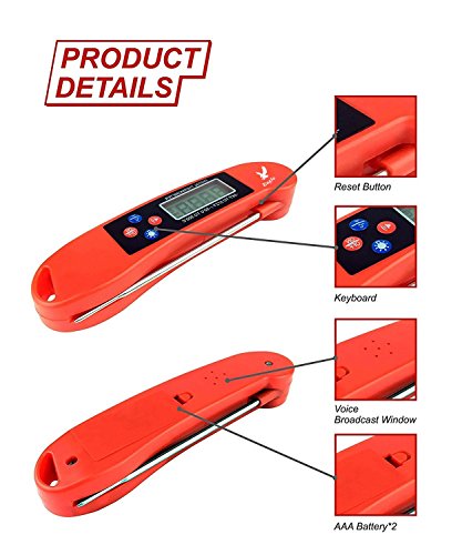 1. It's fast, accurate, easy to use, clean and store. The body is made of durable and eco-friendly material. Perfect for everyday use. 2. Its functions as a meat thermometer probe as good as a candy thermometer. Due to it's multi-functional capabilities it practically can be used with any kind of food and liquids. 3. Long probe with tapered tip provides increased sensitivity. It will smoothly slide in and out of your food without leaving marks. 4. Large LCD display is featured with light function and the embedded speaker will clearly pronounce the displayed temperature just by pressing a button. 5. Auto Shut-off feature saves batteries life.