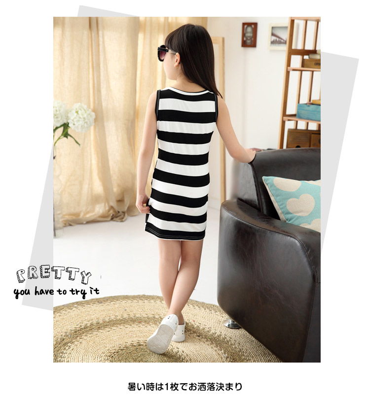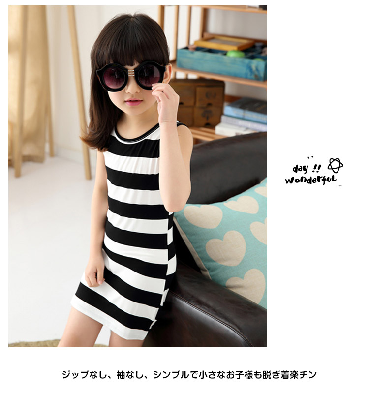 | シンプルでシーズンレスに着用できるタンクトップワンピース太めのボーダー柄が爽やかで清楚感バッチリ暑い時は1枚でお洒落決まり春秋はカーディガンやニットなどプラスして、重ね着スタイルも◎ジップなし、袖なし、シンプルで小さなお子様も脱ぎ着楽チン | |