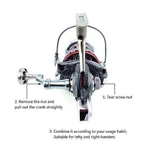-. Feature : Spinning reel with carved snakeskin metal surface, wear-resisting line spooler, corrosion resistant material, both suitable for freshwater and saltwater fishing. / Ergonomic structure: Biaxial system, 10+1 BB, metal reel seat and cable cup, carbon fiber snakeskin shape cover, CNC rocker arm+ metal plum blossom handle. / Metal smooth line spooler, durable to use, more easy for the line outlet and protect the fishing line from breaking down. / Usage methods: 1.Tear screw nut 2.Remove the nut and pull out the crank straightly 3. Combine it according to your usage habit. / Selectable type reel: AFL 8000, AFL 9000, AFL 10000, AFL 11000, AFL12000.