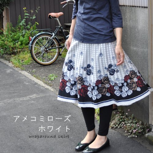 -. Title : スカート ひざ丈 巻きスカート アメコミローズ ホワイト 薔薇 ラップスカート インド綿 フリーサイズ