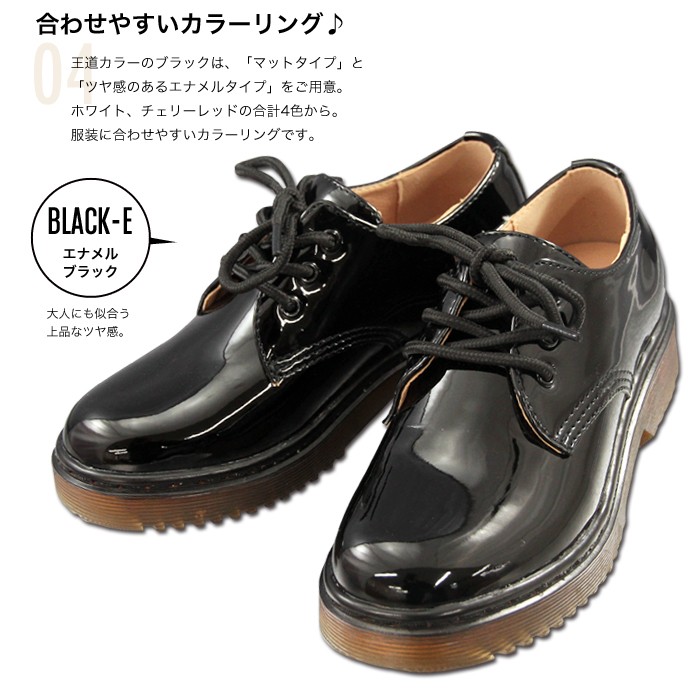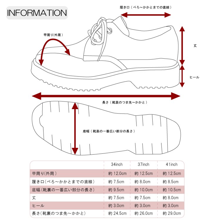 | サイズ | 約22.5cm 約23.0cm 約23.5cm 約24.0cm 約24.5cm 約25.0cm 約25.5cm 約26.0cm | | 実寸 | 画像参照 | | 素材 | アッパー素材:合成皮革 底素材:ラバー | | 生産国 | 中国 | | 裏地 | - | | 生地の伸縮 | - | | 生地の透け感 | - | | カラー | 01. ブラック 02. チェリーレッド 03. ホワイト 04. ブラックエナメル | | 注意点 | ▼綿混合商品は洗濯時に多少縮む事がございます。 ▼パソコン、モニター等の環境により、実際の商品素材カラーが多少異なる場合が御座います。予めご了承ください。 ▼お手数ですが必ずお買い物ガイドを一読頂いてからご利用いただきますようお願い申し上げます。 | |