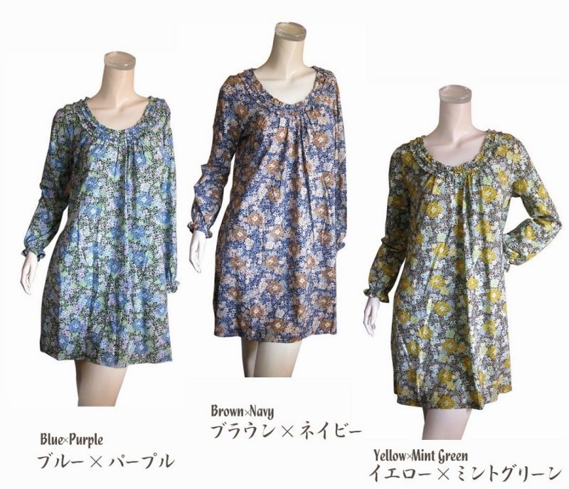 【日本製】 綿100% 繊細な花柄のAラインチュニックワンピース 3色