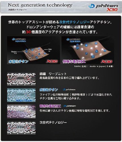 세계의 톱 애슬리트(운동선수)가 인정하는 차세대 테크놀로지『아쿠아 티타늄(티탄)』.드론 언더 웨어의 섬유에는 통상함 침의 약30배 농도의 아쿠아 티타늄(티탄)이 함침 되어 있습니다.※phiten(화이텐)회사의 특수 기술(특허 취득필)에 의해 수용화 된 티타늄(티탄) 금속을 원단에 짜넣고, 특수한 전기 가공을 해 있습니다.