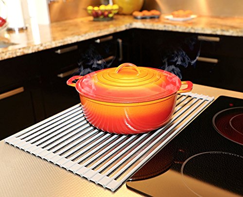 ULTRA VERSATILE DRYING RACK FLATWARE - Our multi-tasker dishes rack shelf sits right over your sink to load up while washing. Air-dries washed dishes, pans, tableware and kitchen utensils. Also functions as a vegetable colander. Just rinse vegetables and fruit and set on the rack so water drips directly into the sink, not on your counters. Need a cooling rack for freshly baked goodies? Use the Trimm dish rack. Cookware too hot to set on a table? Our dish rack can be used as a trivet mat.