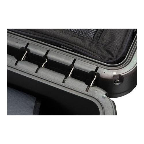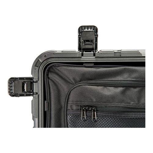 -. Feature : Includes Enhanced Travel System: lid organizer, dopp style toiletry kit, zippered shoe sack, laundry and garment bag Lightweight design Recessed press and pull latches Handle location maximizes interior space Recessed TSA approved combination lock Recessed carry handles (top, bottom and one side) Recessed retractable handle Custom design ball bearing wheels with solid hubs Watertight O-Ring seal Automatic pressure equalization valve Fabric interior spot cleans easily Limited lifetime guarantee o
