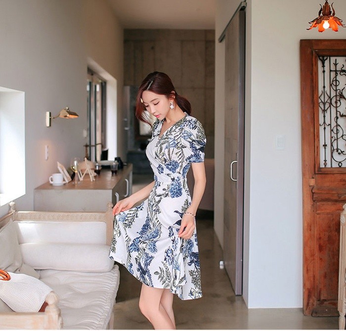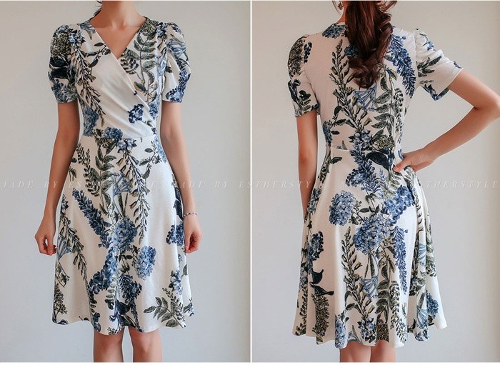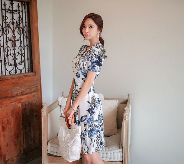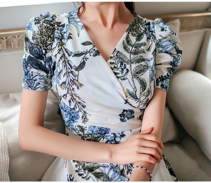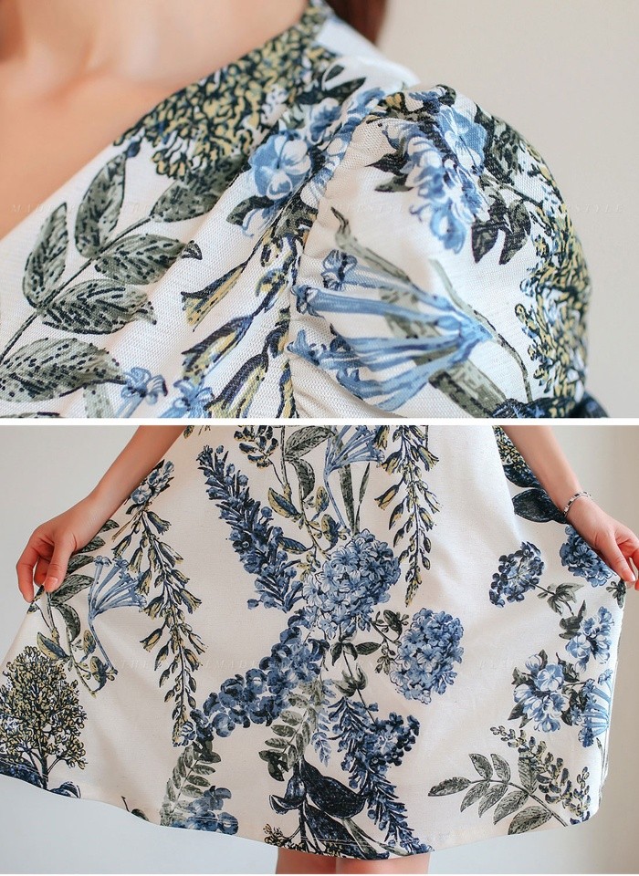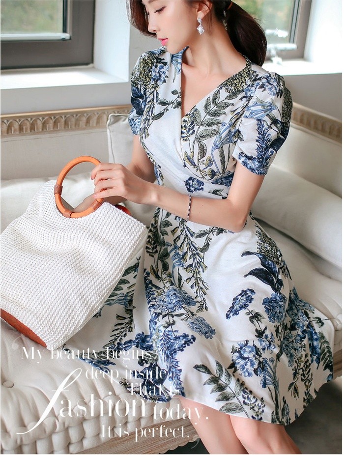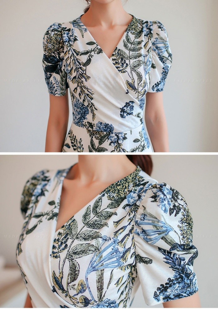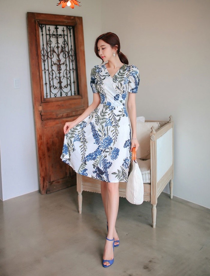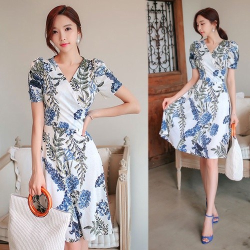 商品名:ワンピース カシュクールワンピ 半袖 ボタニカル フラワー 膝丈