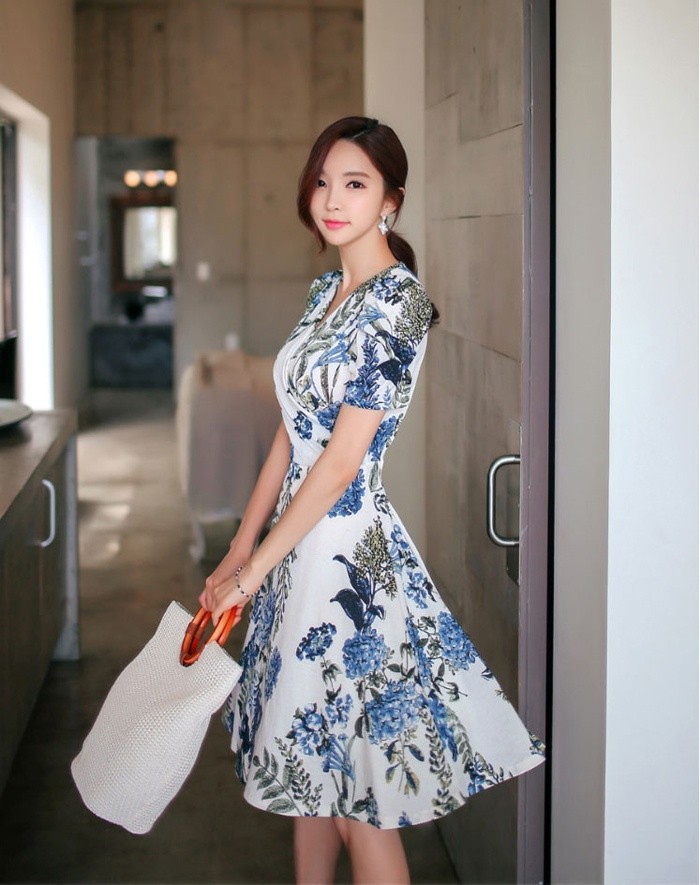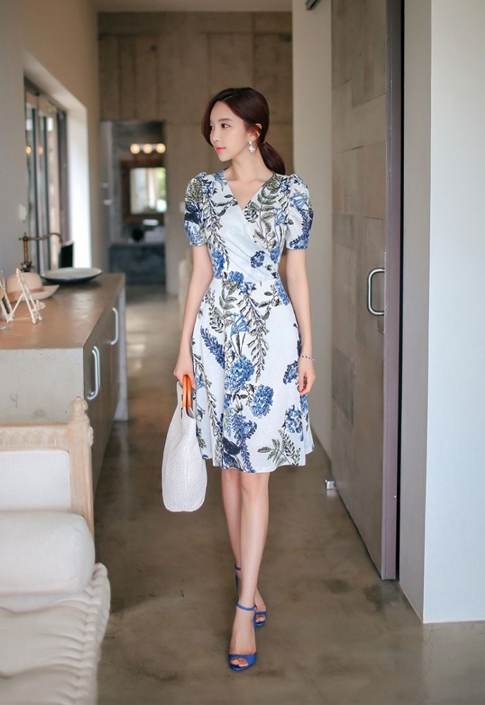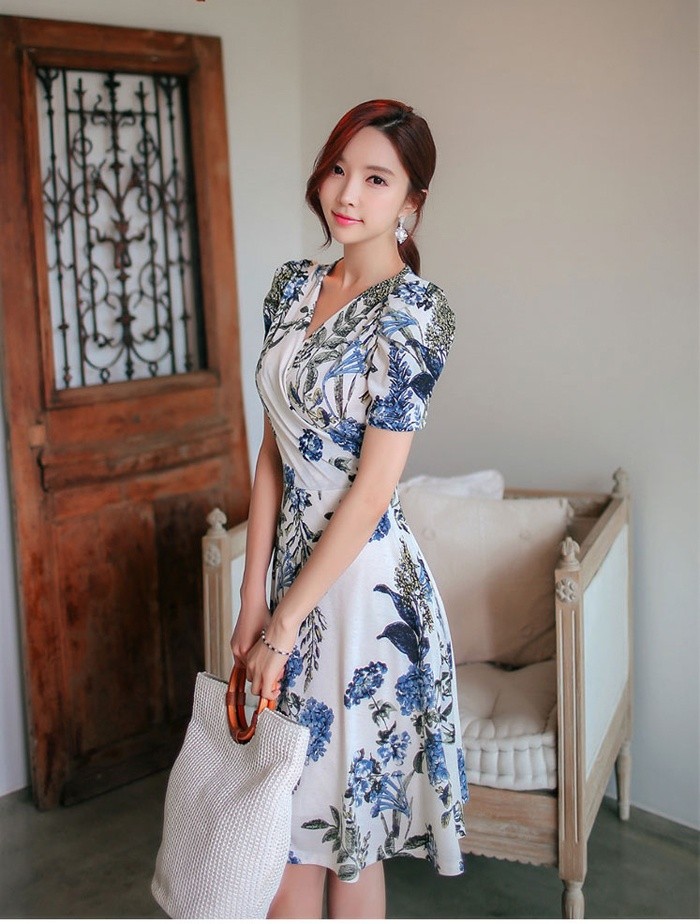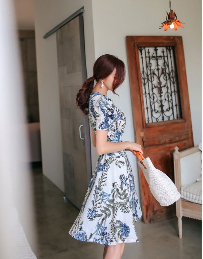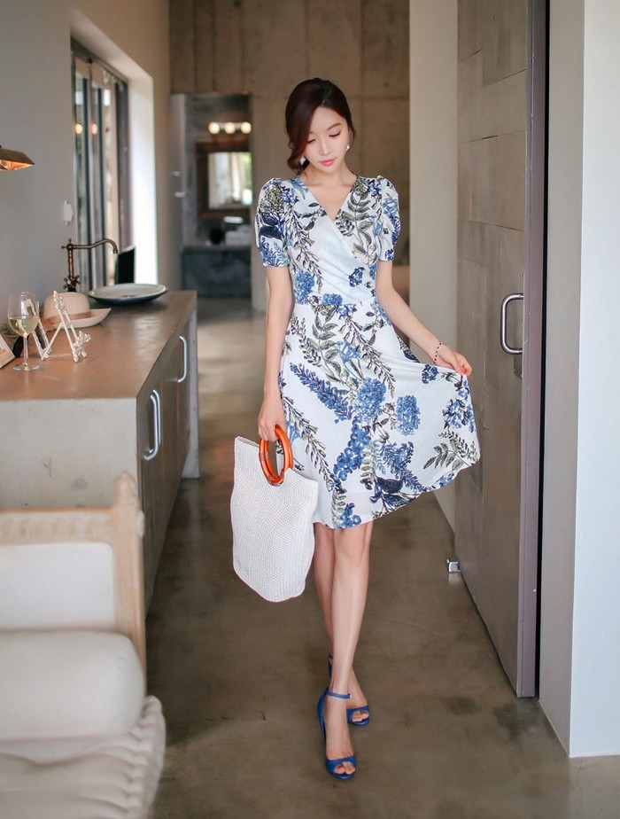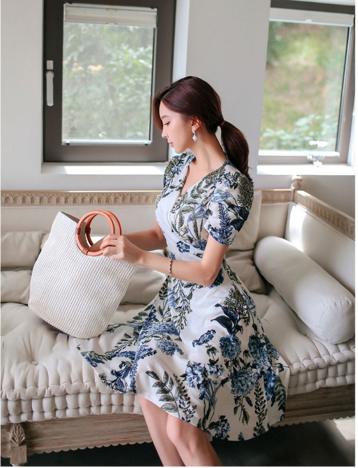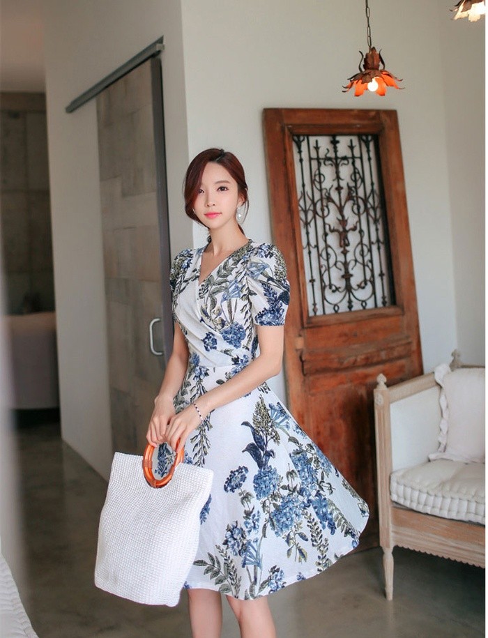 商品名:ワンピース カシュクールワンピ 半袖 ボタニカル フラワー 膝丈
