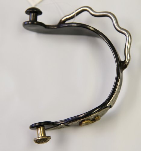 - Pair of black steel humane bumper show spurs with barrel racing motif.