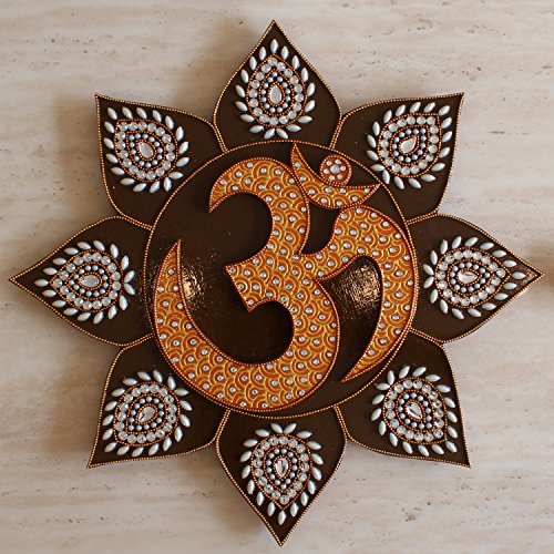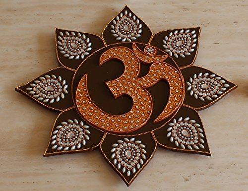 -. Feature : Om symbol or sign represents the beginning of everything in Hindu religion. Based on this philosophy, I have created this wall painting which is ideal for decorating your living room, yoga or meditation room or even office. / In this handcrafted painting, I have incorporated three auspicious Hindu symbols together - Om (Aum, as some might say), lotus flower and sun. / The wall painting is carved out of environment friendly multi-density fibreboard. After creating basic shapes with acrylic paint, I have decorated the wall hanging with tiny bead chains as well different colour beads and mirror beads. / The painting is 13" x 13" from the top end of petal to lower end of petal. There is a hanging hook affixed at the back so you just need a nail on the wall to hang it. / All my works of art are made from environment friendly multi-density fibreboard cutouts. I use high quality acrylic paint, bead chains and beads to hand paint and hand decorate. I also affix a hanging hook on the back for easy wall hanging