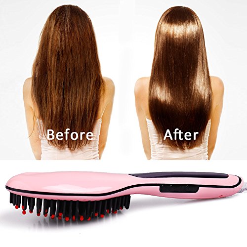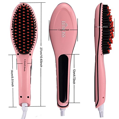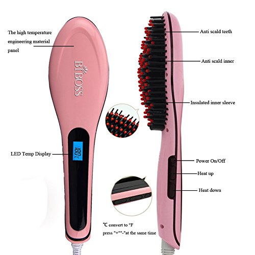 Studio : BIBOSS Publisher : BIBOSS Binding : Misc. Product Description Hair massager ceramic iron straightener detangling comb fashion appearance, the perfect combination of the four together, Portable and powerful, Just modeling yourself at home or travel. 1 inch solid ceramic tourmaline plates and advanced infrared heat technology makes your hair to Straighten, Flip and Curl in a few minutes. The hair straightener is anti-static, anti-scald and anti-hair broken, Easy solve hair knotting, reduce pain and hair broken, repair the hair quality of harm. Head massage make hair follicle of scalp more healthful and bright and elasticity with hair. US safety Plug, Short-Circuit Protection, Leakage Protection, Auto shut-off protection if NOT IN USE for 60 minutes. Dual voltage operation support: 110V~230V Temperature setting guide: Centigrade to Fahrenheit convert: press " ""-"at same time Thicker and curls hair: 410~446℉ (210~230 ℃) Common hair: 374~410℉ (190~210 ℃) Thin and soft hair: 338~392℉ (170~200 ℃) Suggest to choose the Highest Temperature at First time, then reduce the Temp Lever According to Your Hair Quality. Helpful Hair care tips: use Moroccan oil or Agam essential oil hair treatment (Not Included with the package) with BiBOSS Hair straightener brush to message your hair will improve Frizzy Dry Unmanageable hair effectively. Safety precautions and warnings In order to ensure the proper use of this product, please pay attention to the following security matters. 1. Under 14 years-old children using this product must have adult supervision. 2. Keep it dry and don't use it in bathroom and wet area. 3. Please don't knock it and fall off from high-attitude, please don't use if there is any damage. 4. Please don't rework, dismantle and repair this product. 5. This product can't be put into the fire or external heating. 6. Please wait until cooling when pack up this product.
