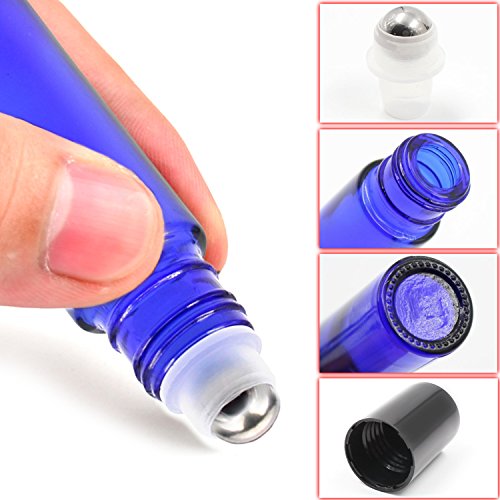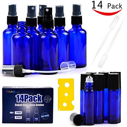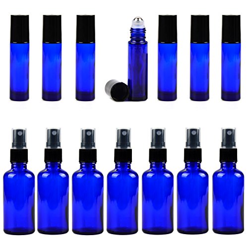 14 Cobalt Blue Essential Oil Bottles , 7 Blue Glass Spray bottles for Essential Oils (2 Ounce) , 7 Essential Oil Blue Glass Stainless Essential Roller Oil Bottles...