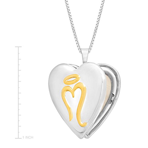 Show your sweet side with this angel heart locket complete with two photo panels to show off those that mean the most to you. Crafted in sterling silver, the 'miracle' motif is plated in 14K gold. Piece measures 1 by 3/4 inches. Comes with a sterling silver 18-inch box chain.Feature