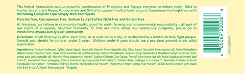 -. Feature : Fluoride Free, Carrageenan Free, Sodium Lauryl Sulfate (SLS) Free, Gluten Free, Vegan / A DIFFERENT APPROACH TO INGREDIENTS - Himalaya Botanique approaches oral care a little differently. We combined Neem leaf, hand-harvested from 'the worlds most researched tree' and combined it with the most popular formula in all of Ayurveda - the three renewing fruits of Triphala, along with the powerful pomegranate fruit and the enzymes from papaya and pineapple to create something meaningfully different / CLEANS TEETH - Neem cleans teeth and gives this formulation its sparkle. Neem is history's original housekeeper and works to keep the mouth clean / WHITER TEETH - Papain and Bromelain, the enzymes from papaya and pineapple, help remove surface stains, so your smile shines brighter than ever / HELPS FIGHT PLAQUE NATURALLY - With regular brushing, this herbal toothpaste formulation containing Neem and Pomegranate helps to fight plaque and freshen your breath