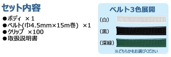 | セット内容 | ボディ ベルト(巾4.5mm×15m巻) クリップ×100 取扱説明書 |
