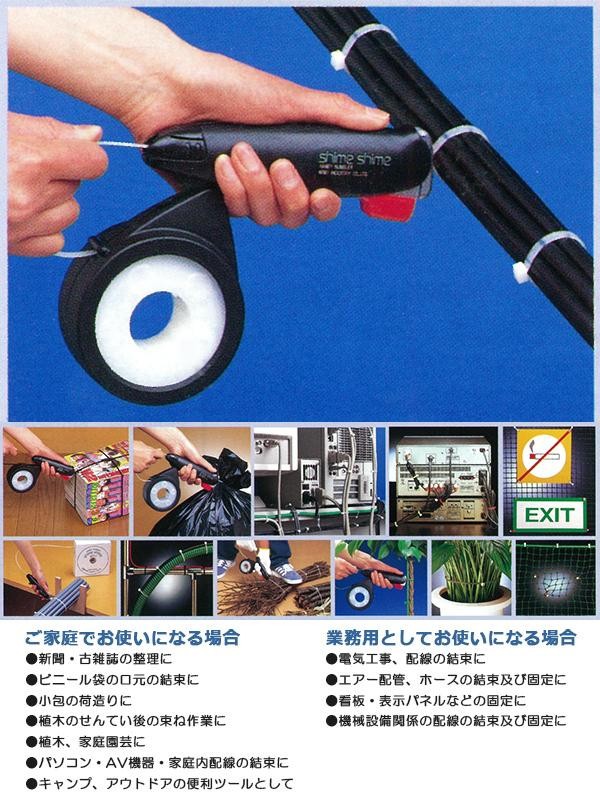 | ご家庭でオフィスで また工業用にとあらゆる場所でさまざまな結束に活用できます いつでもどこでも 何でも結束できる「しめしめ」をあなたのアイデアで楽しく便利にお使いください |