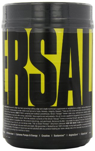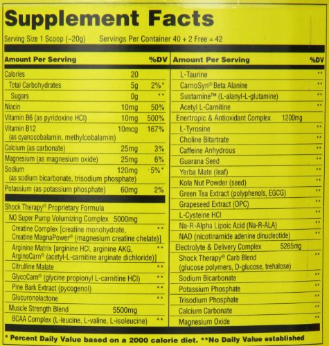 ReleaseDate : 2015-02-25 Studio : Universal Nutrition Publisher : Universal Nutrition Binding : Health and Beauty Product Description A pumping pre-workout powerhouse, shock therapy forever does away with lackluster workouts. Combining proven performance compounds with energy substrates, focus agents and antioxidants, this all-in-one supplement juggernaut locks you in the zone, daring you to dominate the gym. But that's not all. With the anabolic nutrients of the Shock Therapy formula coursing through your veins, the pumps are insane. Freaky. Vascular. Intense. For a bodybuilder, the pump is everything. Just ask arnold. He knows the deal. Volumized. Energized. Powerized. Primed to perform. The best workouts of your life. All just one scoop away. This is shock therapy. Only from Universal. 0