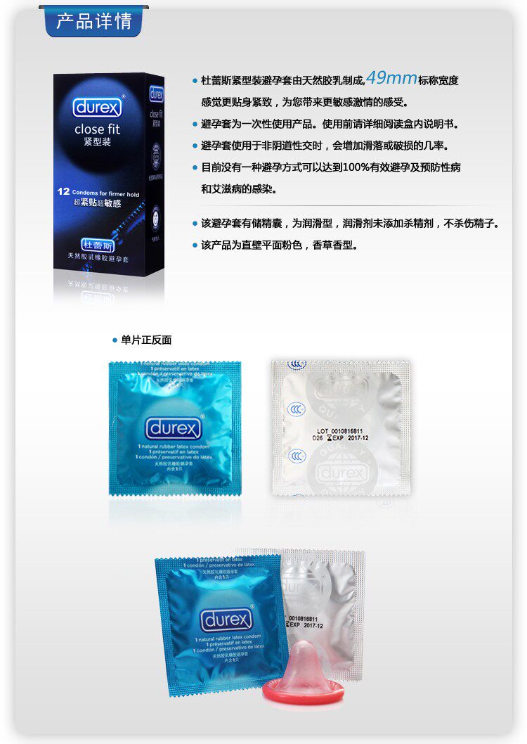 Product Name: Durex tight packaging of the total quantity (pieces): 12 Origin: China Approval Number: SFDA (into) the word 2012 No. 2662523 Material: latex nominal size: small thickness: General appearance shape : Glossy features: tension-type flavor: Vanilla brand: Durex / Durex Model: Tight-type dress