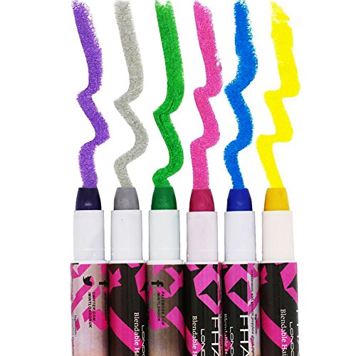 6 Hair chalk pens indcluded 6 bright colors: Silver, Yellow, Rose Red, Purple, Green, Blue; Metallic colors, glitter effect, shows nicely and shiny on all hair colors.