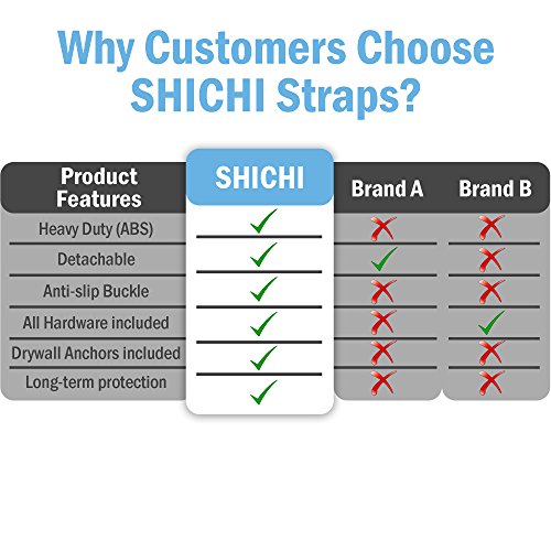 - ✔ SHICHI STRAPS DON’T SLIP… once up, they stay up. No need to worry about low quality buckles slipping. ShiChi straps & buckles are upgraded for securing your furniture with confidence in their safety. Our adjustable furniture anchor kit comes with all the hardware & installs fast, even if there’s a gap between the furniture & wall. Clear instructions included