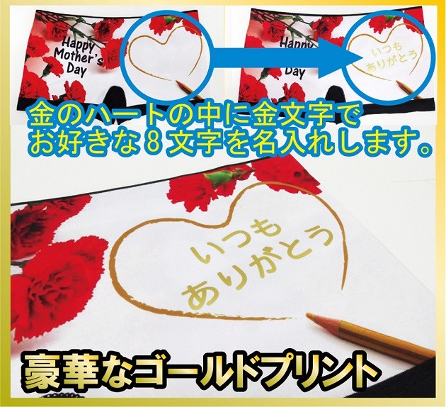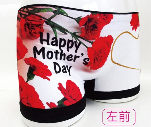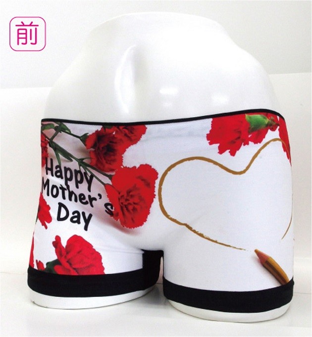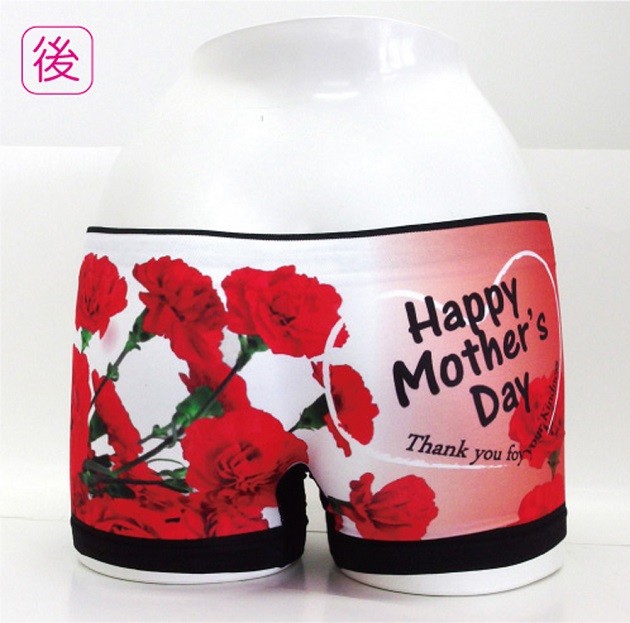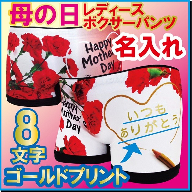 母の日 カーネーション柄 8文字まで名入れできるレディース用ボクサーパンツカーネーションデザインのベースに左フロントにゴールドのハートマーク、ししてその中に8文字まで名入れができます。名入れ文字書体は丸文字でカラーはゴールドになります。。とても豪華なレディースアンダーウエアを日ごろ子育てを頑張るママにプレゼントしてみてはどうですか?シームレスタイプですので、非常に柔らかく伸縮性があるので、スポーツ時のアンダーウエアとして人気のタイプです。