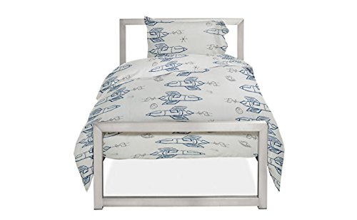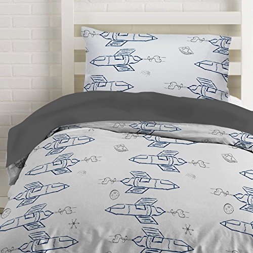 Twin Size Bedding Set includes 1 Duvet Cover and 1 Pillow Case in Rocket Ship Blue and Gray Deisgn