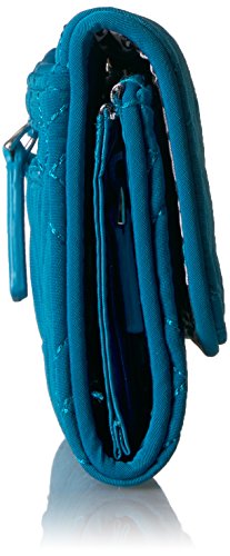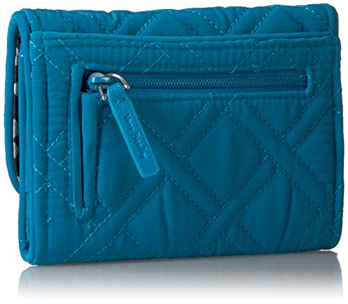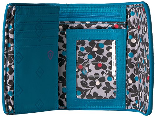 PERFECTLY SIZED: Our Vera Vera RFID Riley Compact Wallet measures 5.25 x 4 inches with RFID protection and featuring 1 zippered exterior pockets, 1 slip pocket, and 13 card slips, 2 bill slips, an ID window, and zip coin pocket