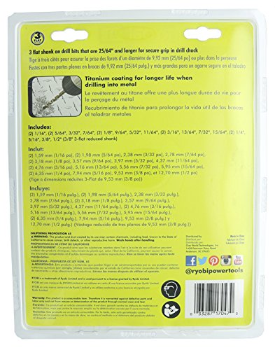 - 11/64", (2)3/16", 13/64", 7/32", 15/64", (2)1/4", 5/16", 3/8" and 1/2" drill bits