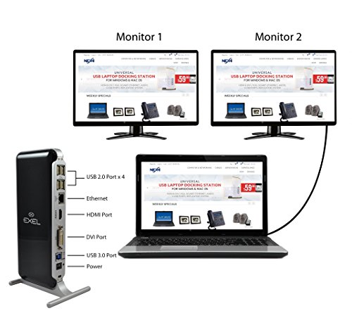 Exel EXEL-DOCKING-STATION USB 3.0/2.0 Universal Laptop Docking Station with Gigabit Ethernet, HDMI, DVI, VGA Outputs Audio for Windows 10, 8.1, 8, 7, Mac OS and Android 6.0 (OTG) and Higher